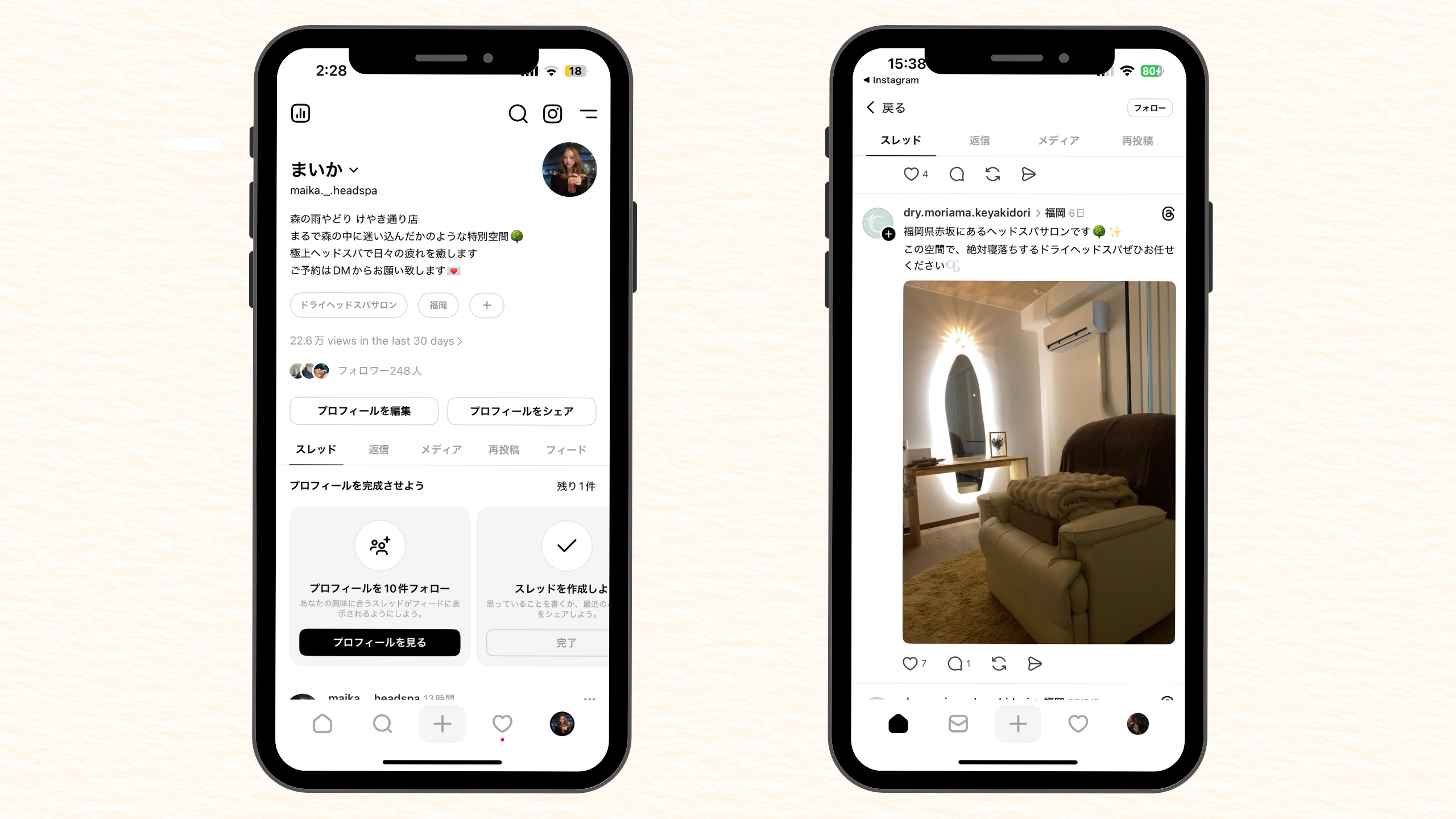 ヘッドスパサロン様の導入事例 2025 9/17 導入事例 2025年9月17日 導入前の課題 ブランドイメージを推進したい 新規顧客を獲得したい 導入後の効果 運用開始わずか2週間で 22件の予約を獲得 連携しているInstagramのDMに 200件以上の問い合わせ Threadsフォロワー数 +267人を獲得 投稿の総閲覧数 170,000回 \ 他の事例に関してもまとめてます! / 資料ダウンロード 導入事例 Threads メンズヘルスケアサロン様の導入事例 薄毛治療サロン様の導入事例