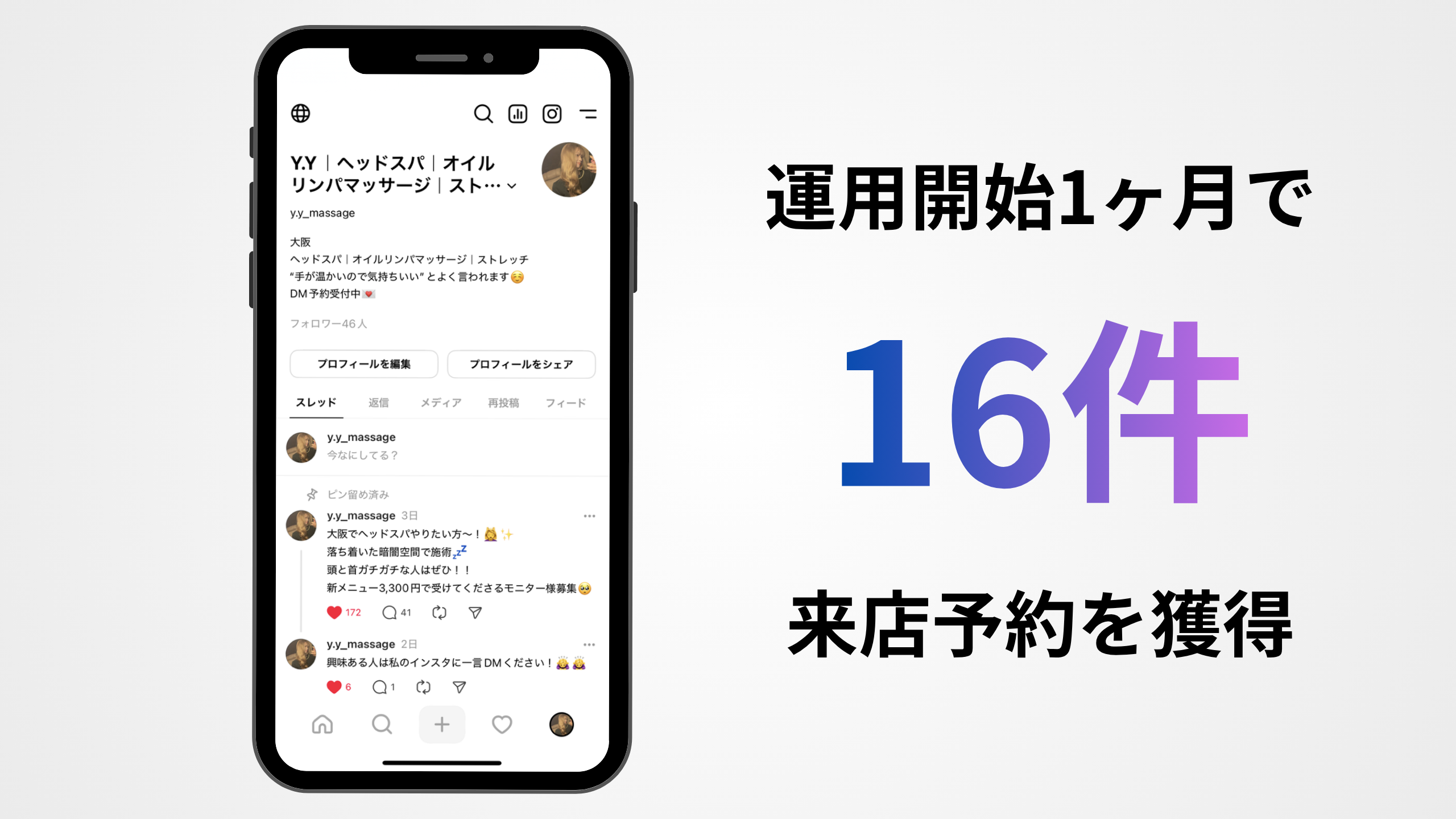 ストレッチサロン様 2025 9/17 導入前の課題 ホットペッパー以外の媒体で集客ができていない 自社でThreadsを運用しているがなかなか成果につながらない 導入後の効果 運用開始1ヶ月で 16件の予約を獲得 来店者のうち 7割以上がリピーター化 投稿の総閲覧数 71,000回以上 連携しているInstagramのDMに 200件以上の問い合わせ \ サービス紹介資料はこちらから! / 資料ダウンロード(無料) 導入事例 Threads 薄毛治療サロン様 メンズ眉サロン様